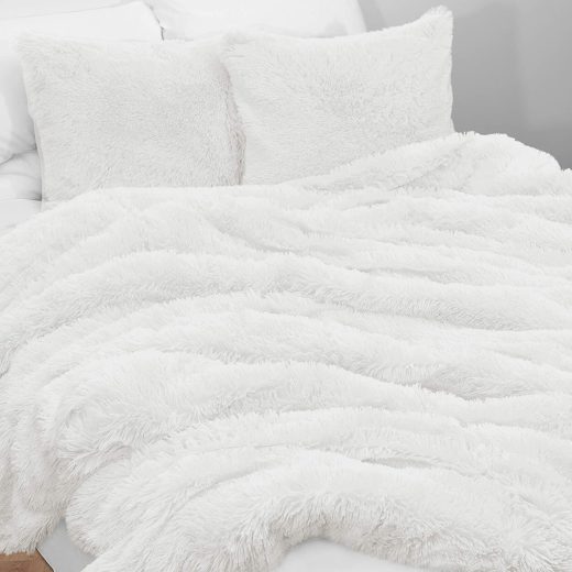 KB & Me Boho Chic Bohemian Bright White Fuzzy Faux Fur Plush Duvet Comforter Cover and Sham 3 pc. Full Queen Size Set Soft Shaggy Fluffy Bedding Bedroom Aesthetic Luxury College Dorm Teen