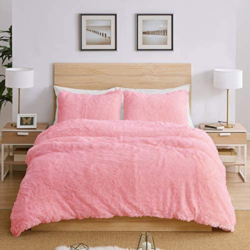 KB & Me Boho Pink Fuzzy Faux Fur Plush Duvet Comforter Cover and Sham 3 pc. Soft Shaggy Fluffy Full/Queen Size Bedding Set Luxury College Dorm Teen