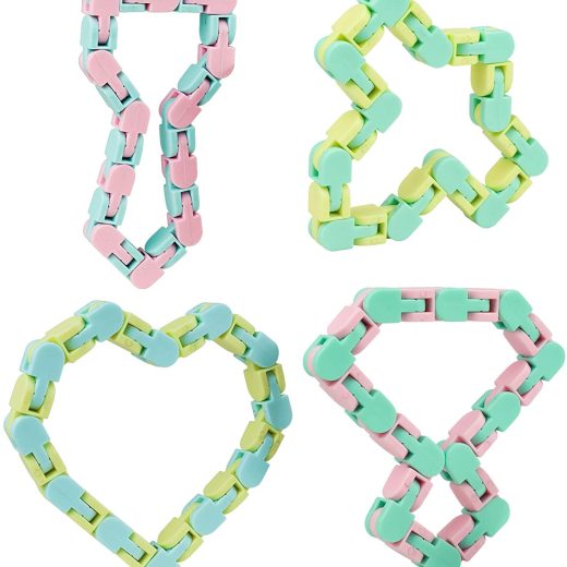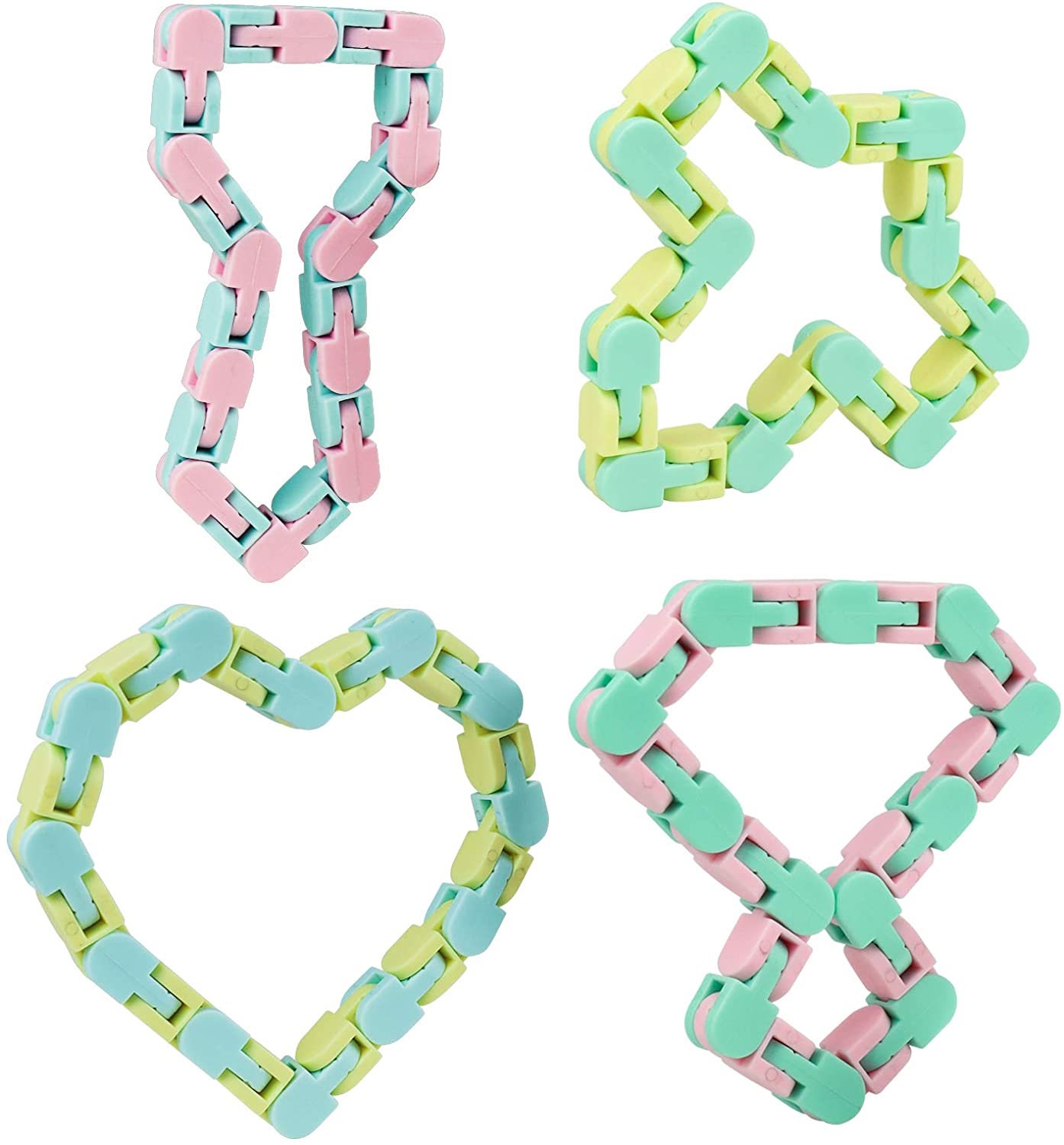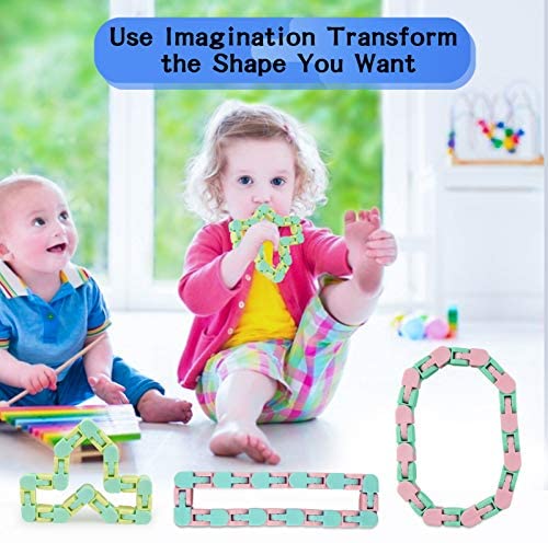 Wacky Tracks Fidget Toy – Snap the links together, they will emit a satisfying click sound.Helps kids to enhance the development of Intelligence and Imagination development. Infinite Shapes – Each of the 24 links can be rotated and locked into 5 positions and you can create any shape you need, such as letters, numbers, symbols, etc. Give your kid fingers and brain a challenge and fun. Stress Relief – Stretch and flip with these fidget toys that will keep your hands busy for hours. Provides a great release and distraction!Definitely great for office fidgeters or kids in school. Party Favors Gift – Sharing fidget toywith other kiddos as well. Kids love these fidget snake were great party favors.Birthday party, kids party bag fillers, christmas gifts, classroom prizes etc. Pocket Size Fidget Toy – Small and easy to keep in pockets and other places. Wacky Tracks great for travel,car,keep in your pocket for waiting time.Help you pass the boring time!