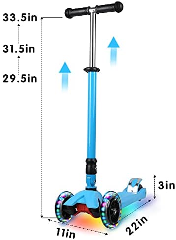 FOLDABLE & HEIGHT-ADJUSTABLE: The scooter can be easily folded (foldable), which is very suitable for transportation and storage while driving and traveling. The handlebar height on the scooter has 3 adjustable options (29.5 inches, 31.5 inches, 33.5 inches) to adapt to the height changes of children of different ages. This is definitely an indispensable toy companion for children on holiday.