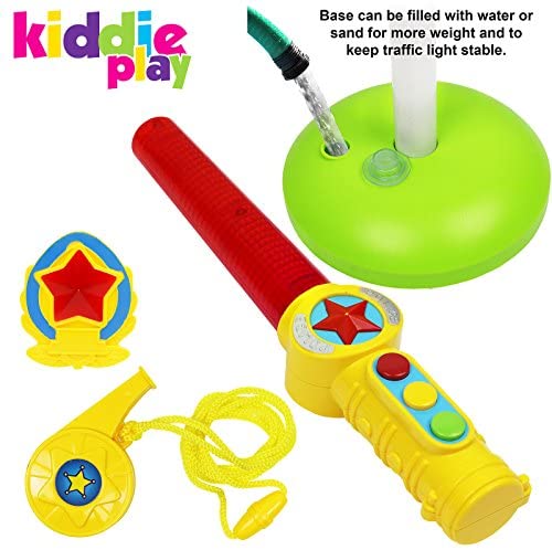 Dimensions: 25.5 high x 8 wide. Traffic light requires 3 AA batteries (not included). Traffic wand requires 3 AAA batteries (not included)