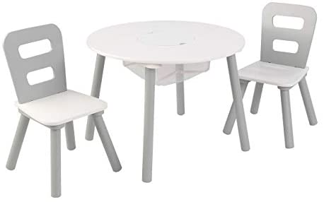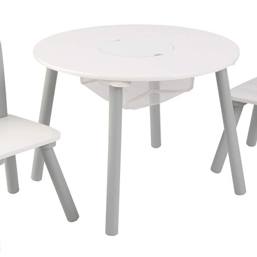 KidKraft Wooden Round Table & 2 Chair Set with Center Mesh Storage, Kids Furniture, Gray & White, Gift for Ages 3-6