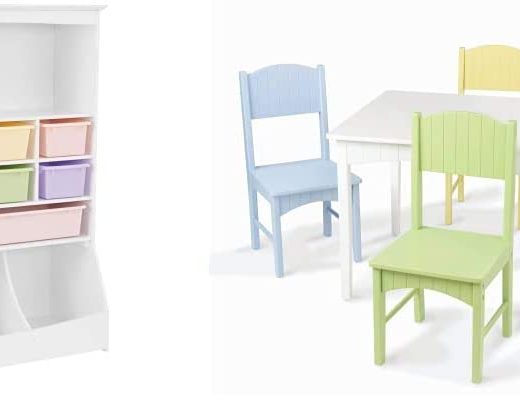 KidKraft Wooden Wall Storage Unit with 8 Plastic Bins & 13 Compartments – White, 53 x 20 x 8Now thats a lot of storage. Our Wall Storage Unit is over 4 tall and provides is perfect for keeping books, toys, sports equipment, shoes and more in one convenient location.The KidKraft Wall Storage Unit will be the center of your play space! With plenty of shelves for books, removable plastic storage bins for small toys and expanded wooden storage bins on the bottom for stuffed animals, balls and more, this toy storage unit has a place for everything.KidKraft Nantucket Table & 4 Chair Set – PastelGreat for board games, tea parties, and arts and crafts, our Nantucket Table and 4 Chair Set includes: 1 white, square table and 4 chairs in pastel colors of pink, sage, buttercup and sky blue.The KidKraft Nantucket Table & 4 Chair Set is a perfectly kid-sized set that will be the centerpiece of any fun kids’ space. It’s a great place to gather for a game, crafts or to enjoy a snack. The classic, elegant style of KidKraft’s Nantucket collection echoes the sensible charm of New England with gentle curves and wainscoting-style paneling.