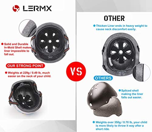 LX LERMX Kids bike helmet for toddlers to 3-8 years combines thick and durable In-mold polycarbonate shell with shock-absorbing EPS Foam Liner Absorbs Impacts and safely protects their little noggins from impact while providing comfort