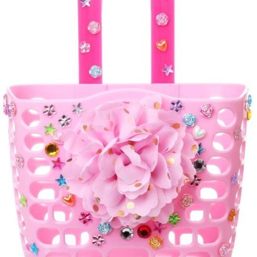Kids Bike Basket, Cute Flower + Bling DIY Crystal Stickers Bicycle Front Handlebar Basket for Kid Girls (Pink Flower)