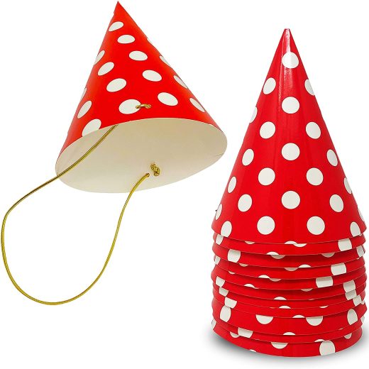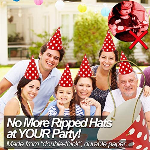 DURABLE REUSABLE CARDSTOCK – These hats are durable enough to reuse for multiple parties. Other party hats are made with flimsy printer paper, which makes assembling the hats, enjoying the party, and reusing the hats very difficult. FULLY-ASSEMBLED CONVENIENCE – No folding, gluing, latching, hooking or tying! These hats are party-ready as soon as you open the box. HIGH GLOSS SHINE – Bright red and white polka dots POP from across the room. Thick durable cardstock allows for this high-gloss shine. COMFORTABLE FIT FOR KIDS AND ADULTS – Chin strap is stretchy elastic for a secure and comfortable fit on both children and adults. ENOUGH FOR ALL GUESTS – Pack of 11 hats for 10 guests and 1 birthday boy, girl, mom, dad, grandma or grandpa!