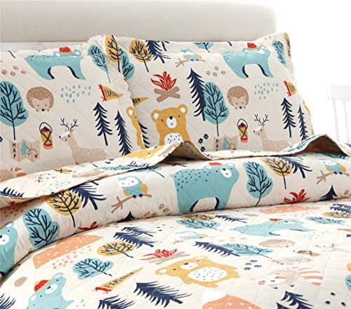 Kids Quilt Bedspreads Full/Queen Size Bear Bedding Set,3Pcs Forest Trees Animals Coverlets Set,Lightweight Reversible Cartoon Bedspread Deer Owl Bedding Pillow Shams