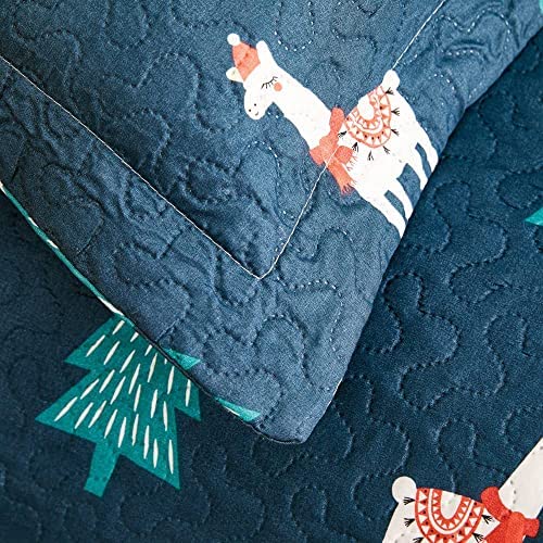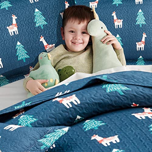 Kids Quilt Set Twin Size, Blue 3 Piece Alpaca Pine Tree Bedcover Animal Cartoon Printed Bedding Set Reversible Lightweight Bedspread Coverlet Holiday Bedroom Decor Gift for Boys All Season(68