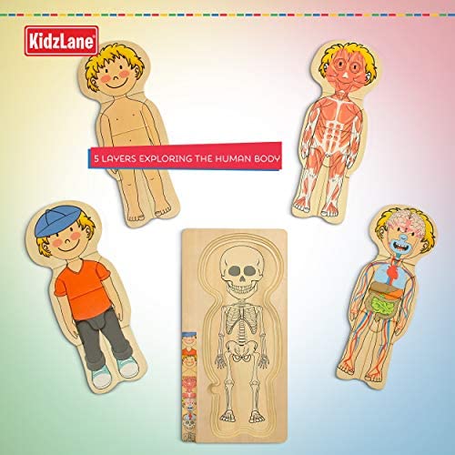 WOODEN KIDS ANATOMY PUZZLE : Let your child discover the wonders of the human body with a 5-layer wooden puzzle that explores the skeletal, respiratory, digestive, and muscular system. Promotes body positivity and confidence with a child-friendly diagram of correct anatomy. FUN & EDUCATIONAL : Thick & sturdy puzzle pieces are easy for kids to handle. Build little Tommy layer by layer by finding the correct spot to place each piece. Notches at the side allow kids to grip and remove individual pieces to fix little mistakes. TRUSTED KIDZLANE QUALITY : This childrens’ human puzzle is built to last with high-quality wood that’s BPA free, lead free, phthalate free and 100% child safety-certified. It also features smooth, rounded edges for added safety. WONDERFUL GIFT IDEA : Toddlers and kids will love to assemble this body part puzzle again and again! Put a smile on their face when presenting this fun and unique anatomy toy for an outstanding Christmas or birthday gift. MONEY BACK GUARANTEE : We maintain the strictest quality control to ensure our toys meet your expectations for quality, durability and design. If you don’t love this toddler anatomy toy, please contact us for a satisfactory resolution or your money back.