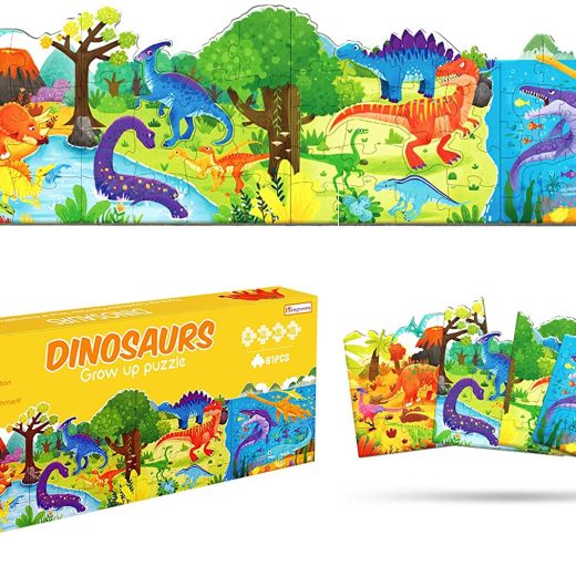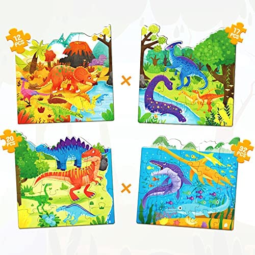 Premium MaterialBoth puzzles and box are made of high quality, eco-friendly material, using recycled grey cardboard, sturdy and bend-resistant that will not tear or break. 81-Piece Dinosaur PuzzleJigsaw Puzzle is an 81-piece 4 in 1 dinosaur puzzle ,A variety of different puzzle pieces can make kids Feel challenged and fun while playing toddler puzzles game Helps Develop SkillsKids dinosaur puzzle helps kids develop hand-eye coordination, fine motor ability, sense of accomplishment,and knowledge of our planet’s history. Excellent Gift Of KidsChildren love dinosaur puzzle! Good gifts for your little boy and little girl at home and let your kids create colorful dreams for their childhood. After-Sales ServiceWe will provide 24-hour customer service. If you have any questions about our dinosaur puzzle, you can contact us at any time, we will reply to you and give you a good service.
