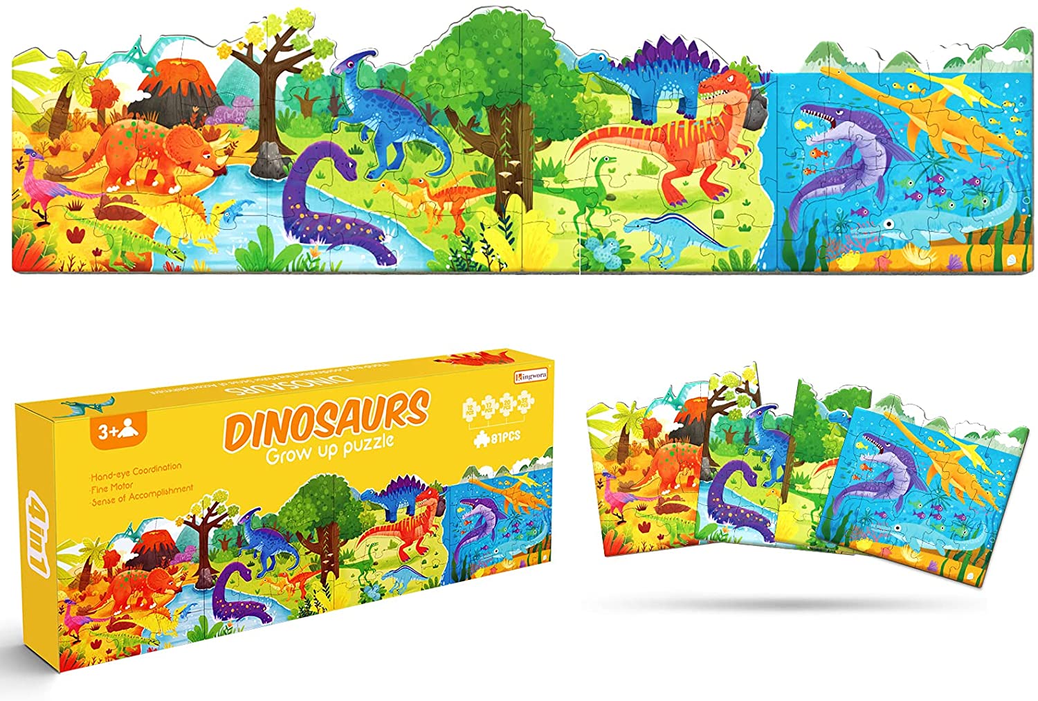 Kingwora Dinosaur Puzzle,81 Piece 4 in 1 Dinosaur Floor Puzzle, Dinosaur Puzzle for Kids Ages 3-5, Colorful Illustrated Designed, Preschool Learning Educational Toy for Boys and Girls(39x10in)