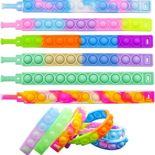 SIMPLE DIMPLE FIDGET WRISTBAND: Package includes 6 pcs simple dimple wristbands, made of high quality silicone material, durable and reusable, soft and flexible, good fidget toy to relieve stress and get fun.The silicone bracelets come in six different colors and two of them are luminous. UNIQUE DESIGN:Unique bracelets toys push pop bubble fidget toys is the latest design and unique. Finger pressing has the effect of relieving pressure and encouraging tactile stimulation, calmness and concentration. Helps reduce stress on children and adults through continuous finger movement. FASHIIONABLE FIDGET BRACELETS: These Push bubble sensory toys can be used as fashionable and cool bracelets suitable for all-age wear and any occasion. Perfect for sports, gym, party, team training, souvenirs, promotional and marketing materials, etc. It’s a great fashion accessories products. WIDE RANGE OF APPLICATIONGS:stress relief toys are suitable for adults and children with anxiety, attention deficit hyperactivity disorder, autism and other special sensory needs. Used for travel, on the road, office, break between classes, etc. 30 DAY AFTER-SALE SERVICE: Customer shopping experience is very important. If you have any quality problems with our products, please contact us!