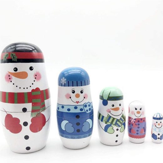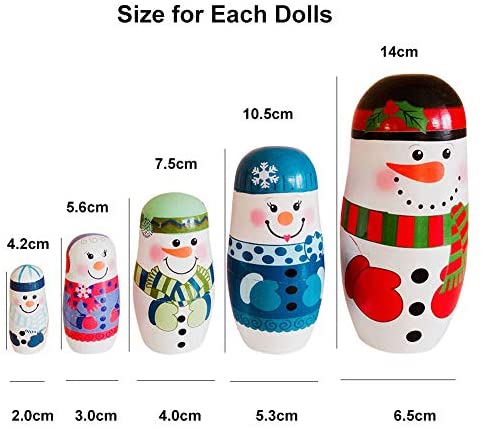 Cute ShapeFive different colors and patterns snowman dolls.Both nice for kids as toys and for adults as collection or decoration. Good ChoiceMade from basswood, sturdy, lightweight and durable quality from tall 14×6.5cm.Kids will love to play with them,enjoy the fun of taking them apart and reassembling. HandmadePainted with eco-friendly and paints one by one.Naturally dried and sealed with plastic bag.All of them are painted with great details,making them visually stunning in different angles Multi-function GiftA special gift for kids /Adult,Christmas, Valentine, birthday and other festival time.You can also decorate your home or room with such cute art crafts. Also be used to hold jewelry, sundries, candy, etc. Easy to Open – Adult / kids are able to open and close these wooden nesting dolls by themselves. Please note,as it is wood product,it will affect by weather.If it is hard to open the big one,then please use the candle to loosen it.