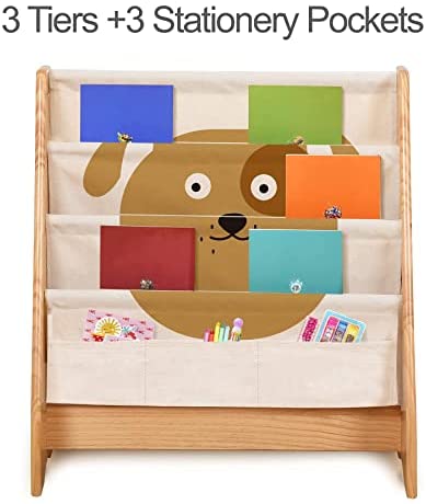 Solid Wood Bookshelf For Kids: 100% natural solid wood from pine, not cheap MDF or plywood, no glue included, more safety for children Kid-friendly: The perfect height of the kid book shelf fits Children perfectly for your little one to help them get their books easily Durable And Safe: KRAND kids bookrack is made of strong & sturdy wood frame, which will stand up to years of use. Bottom-big triangle structure prevents it from leaning forward, together with round corners, making it quite safe for your kids. Promote Organization: A 3-tier bookcase and 3 bottom stationary pockets for kids ages 2 years and up to reach books to tidy up their room. Easy Assembly: The sling book rack is easy to assemble with all accessories included in the pack