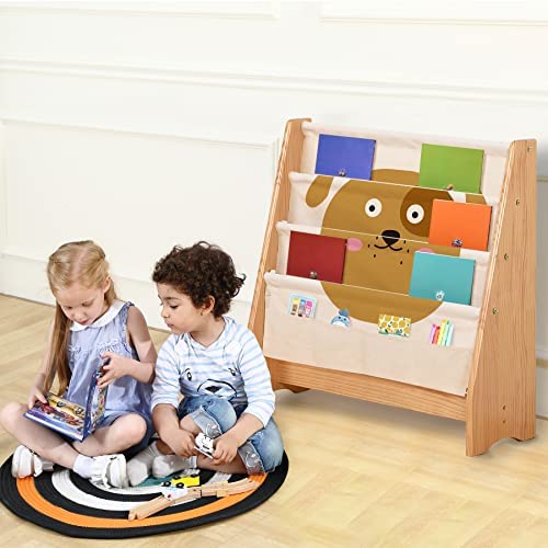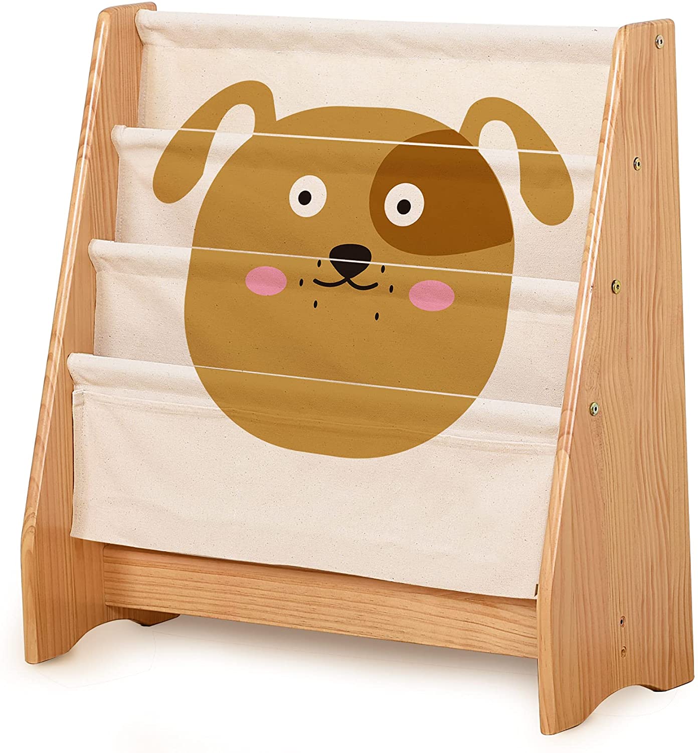 KRAND Storage Bookshelf for Kids 100% Pine Solid Wood Kid Bookcase Children Book Rack with Stationery Pocket (Doggie)