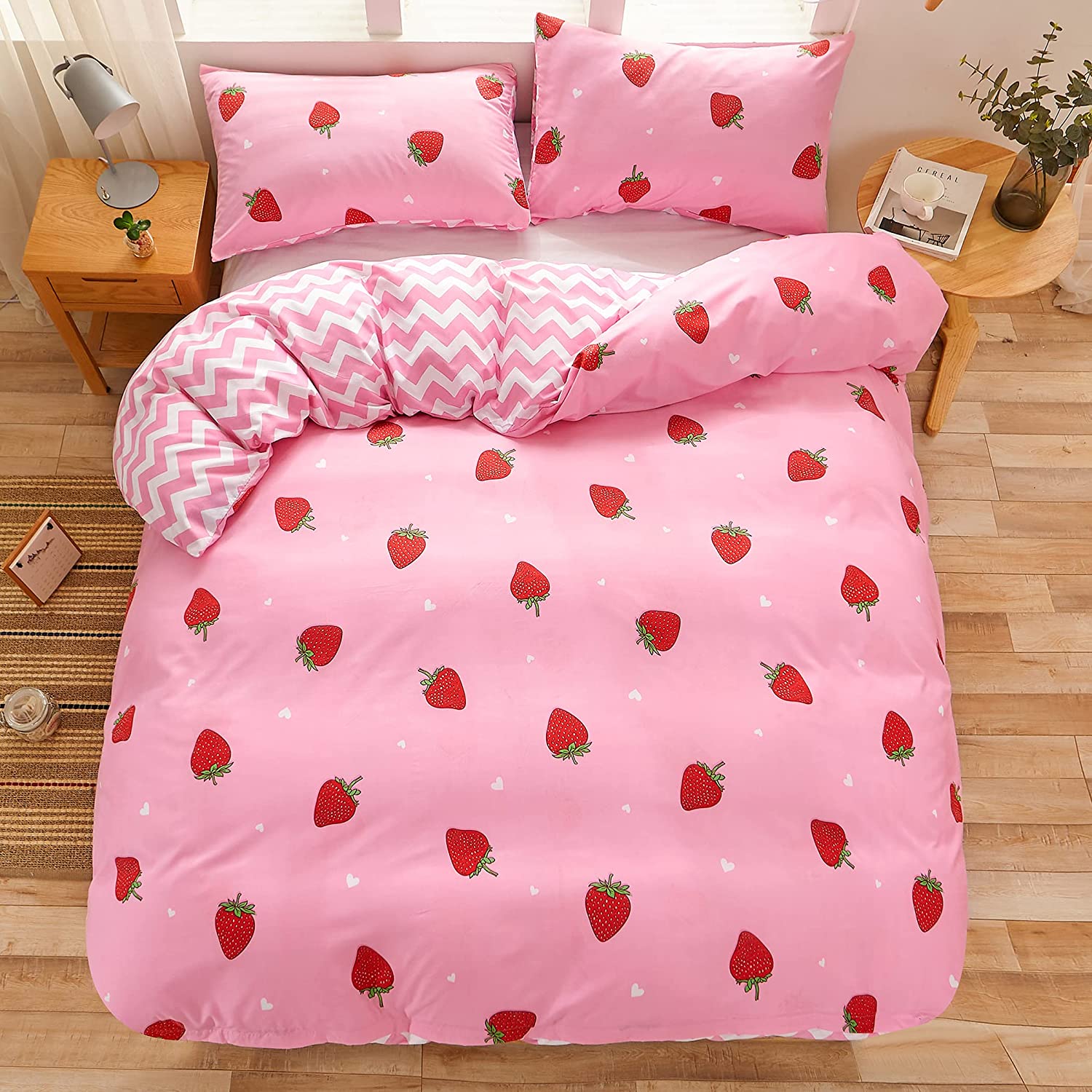 LAMEJOR Kawaii Duvet Cover Set Queen Size Pink Strawberry Pattern Sweet Reversible Bedding Set Comforter Cover (1 Duvet Cover+2 Pillowcases)