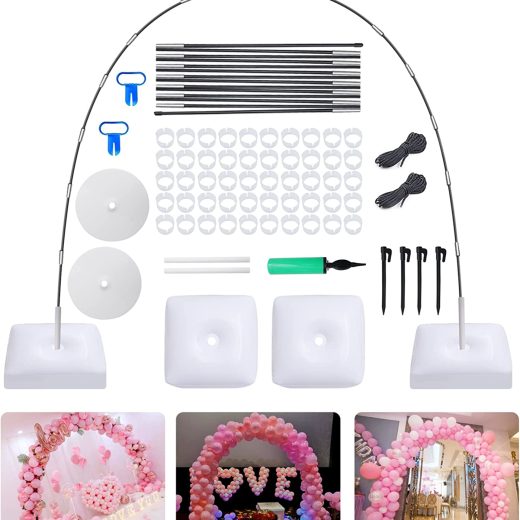 WHAT YOU GETLarge Balloon arch Kit include 15 Folded Glass Fiber Pole, 2 PVC Base, 2 water refillable bag, 2 long pipe, 2 short pipe, 50 balloon clips, 1 Manual Air Pump 2 Balloon Knotters 2 Outdoor Secure ropes 4 Ground Nails. HIGH QUALITYThe balloon arch kit contains 15 foldable fiber pole,also equipped with 2 plastic base,,firm and durable.In order to make the balloon arch more stable, we also equipped with 2 water injection bag. In the end, each column base is very stable. Widely used for various situation: This balloon arch kit is a perfect decoration for party photo booth ,wedding, bridal events, Graduation,Birthday Decoration ,Candy Buffets, Dessert Tables,Boy & Girl Baby Showers, Christmas decoration, New Years Decoration And More You can reuse it on various occasions EASY TO ASSEMBLE: Only 2 Minutes, Slot balloon knots into buckles, connect poles and make adjustment the height and width, fill additional water bag weight can added to bases Keep it stable, Insert the folded glass fiber balloon pole into the base. QUALITY SERVICE: Make Sure Your Party Is unforgettable & Happy! Our mission is to offer the best products easy and efficient Balloon arch kit for all customers. You can reuse it on various occasions.