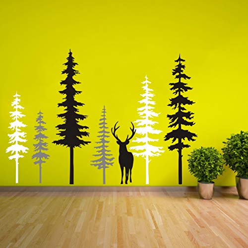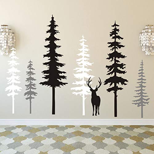 Large Forest Pine Tree with Deer Wall Decals Woodland Trees Wall Sticker for Nursery Room Art Kids Room Bedroom Decoration Forest Tree Animal Wall Mural (White+Gray+Black W/Deer)