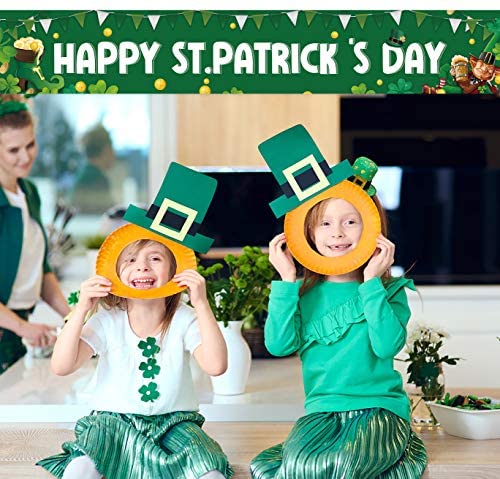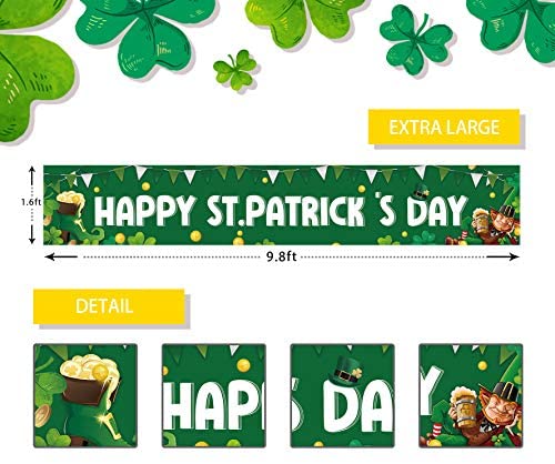 Large Happy St. Patricks Day Banner, Shamrock St. Patricks Day Sign, Lucky Clover Leaves Irish St. Patrick Day Decorations(9.8 X 1.6 Feet)