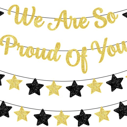 LARGE SIZE – 10 FEET | PRE- ASSEMBLED GLITTERING GRADUATION BANNER – Your time is our priority so we sent you this black and gold graduation decorations 2022 pre-assembled and ready to use .This We are So Proud of You Banner with Star Garland Black and Gold has got all that you need with large size of 10 feet, with 2 strings with no DIY required as it comes pre assembled saving your time and effort and making your graduation party more elegant and exciting. REUSABLE | NO DIY REQUIRED | GREAT VALUE WITH A PREMIUM QUALITY – This 2022 Graduation Banner is sturdy and reusable. This graduation decorations black and gold glitter is made with Grade A quality cardstock material and the glitter powder from the banner wont fall off. This 2022 graduation decor is hassel- free and can be re used for next year graduation, it has got the style along with being sturdy. BUY WITH CONFIDENCE | 100% SATISFACTION GUARANTEED – Make your graduation party more elegant and luxurious with our graduation 2022 decorations black and gold. You will be 100% satisfied with our incredible style of Graduation party decorations and if unhappy we guarantee you full money refund no questions asked LUXURIOUS AND SHINING GOLD AND BLACK GRADUATION DECORATIONS 2022 – Level up your decorative skills! Create the ultimate festive atmosphere with this vibrant glitter Large We Are So Proud Of You Graduation Banner. You can hang this banner as a wall backdrop for college graduation decorations 2022, kindergarten graduation decorations 2022 or use as porch sign, table decorations or as graduation car parade decorations 2022 PICTURE-PERFECT GRAD PARTY FAVORS – This Graduation Banner 2022 are an easy way to add classic style to your graduation party. Click numerous pictures with you friends and family and create fun and memorable moments with our elegant 2022 graduation decorations black and gold that will level up your party and will leave your guests awestruck.