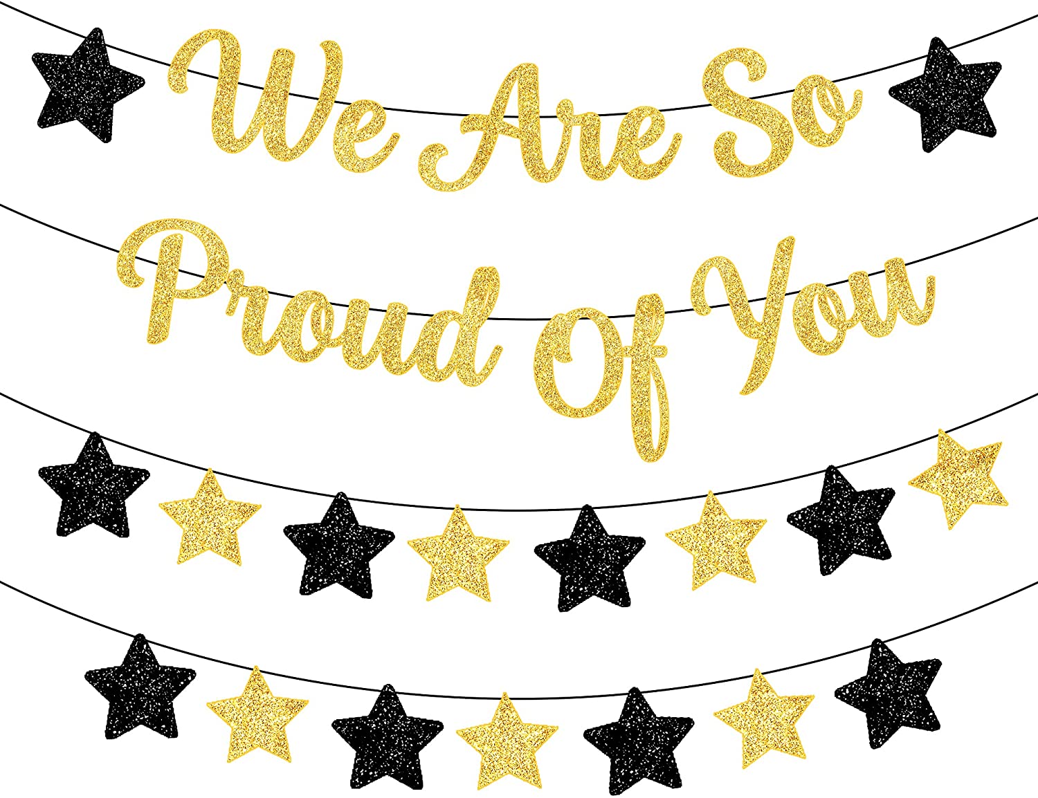 Large, We Are So Proud Of You Banner with Star Garland – 10 Feet, Gold Glitter, No DIY | Black and Gold Graduation Decorations 2022 | Graduation Banner for Class of 2022 Congrats Grad Party Decor