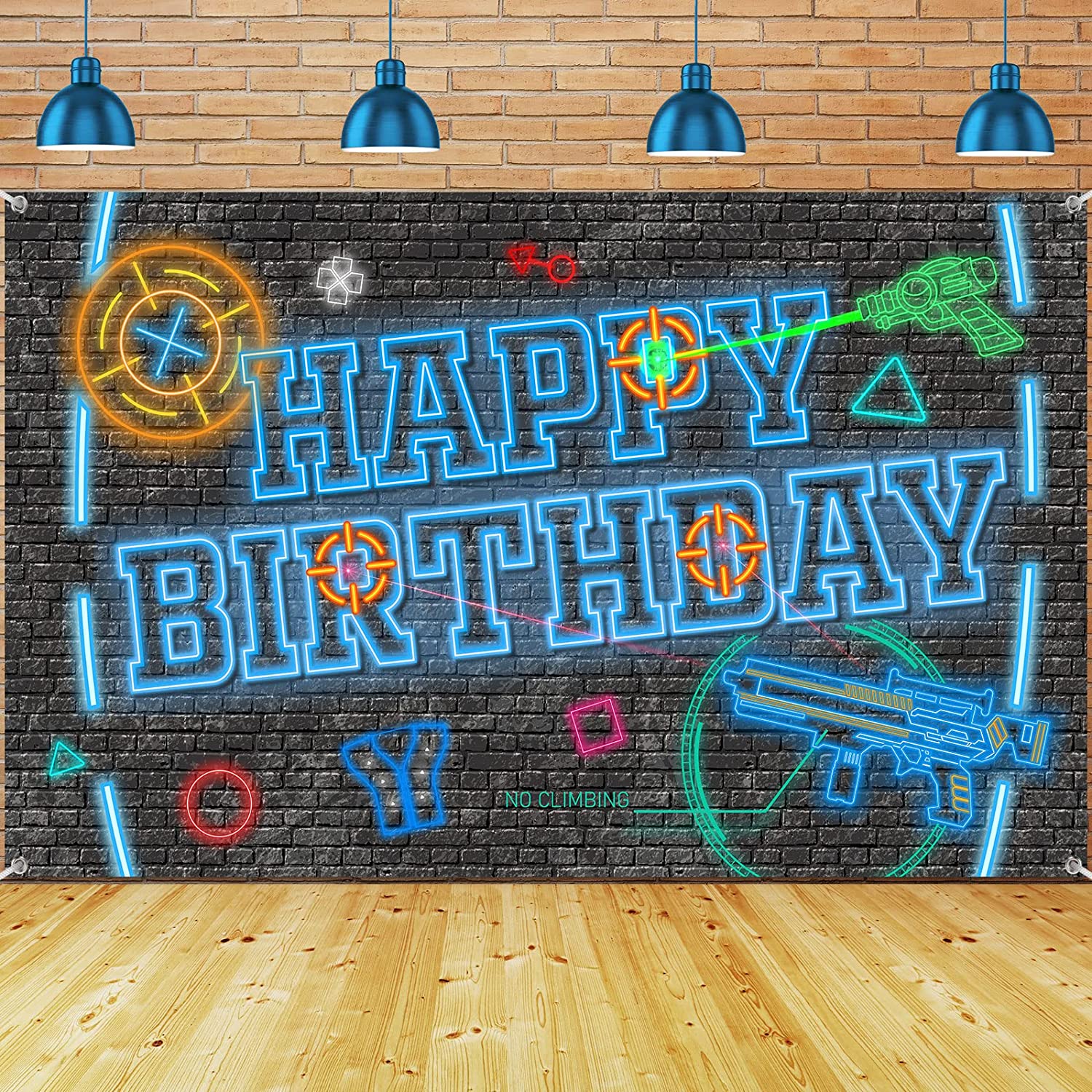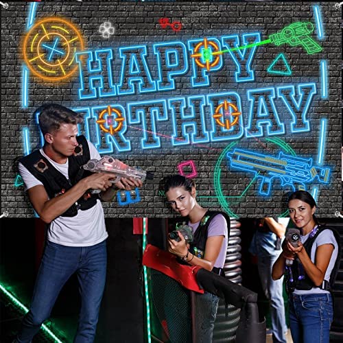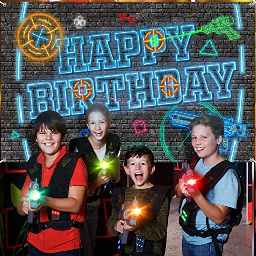 Laser Tag Gun Backdrops Neon Happy Birthday Banner Happy Birthday Backdrop Gaming Backgrounds for Boys Wall Decorations 6 x 3.6 Feet Birthday Party Neon Glow Party Photography Banner Photo Booth