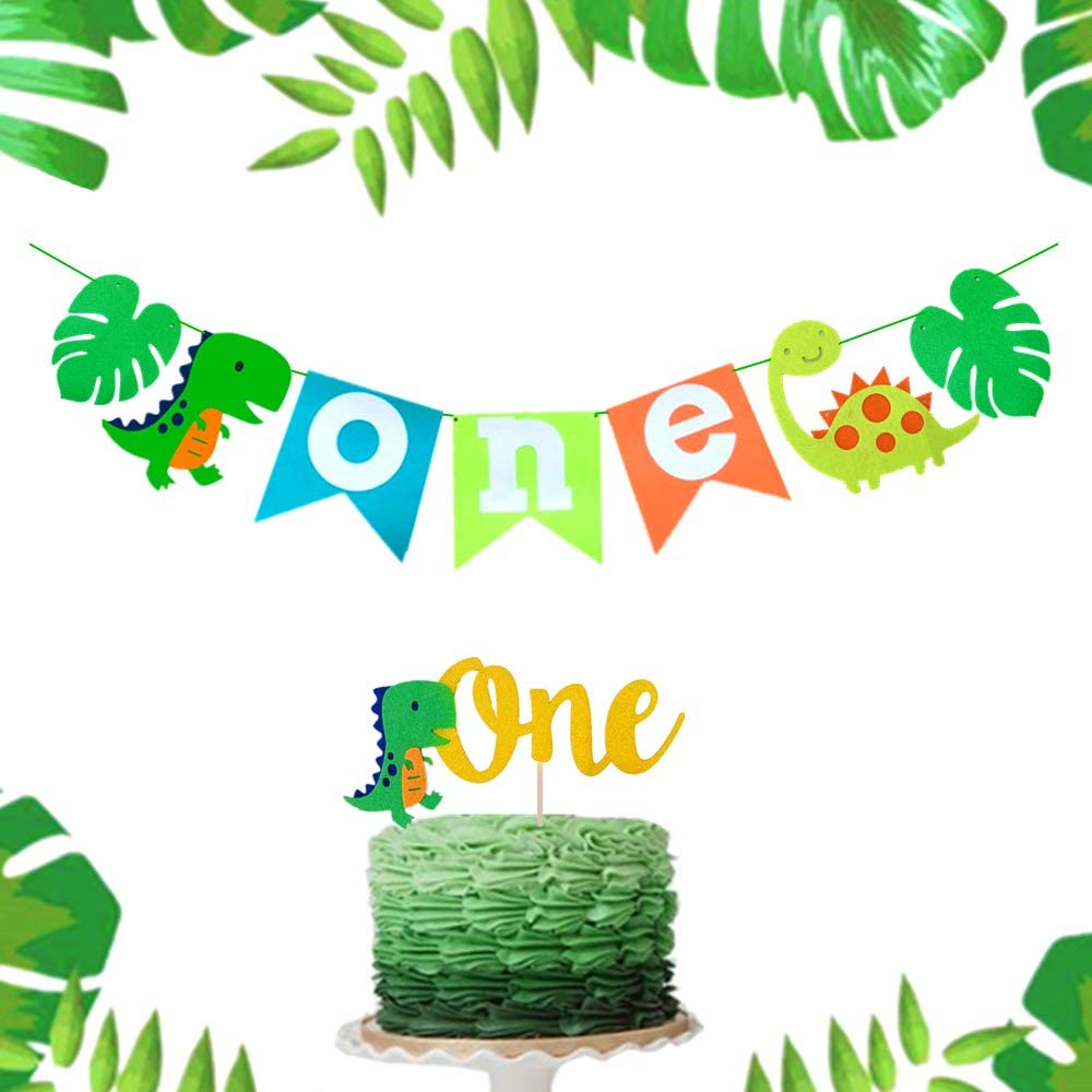 LaVenty Set of 2 Dinosaur First Birthday Banner Dinosaur One Cake Topper Dinosaur 1st Birthday High Chair Banner Dinosaur Birthday Party Decoration Dinosaur ONE High Chair Banner