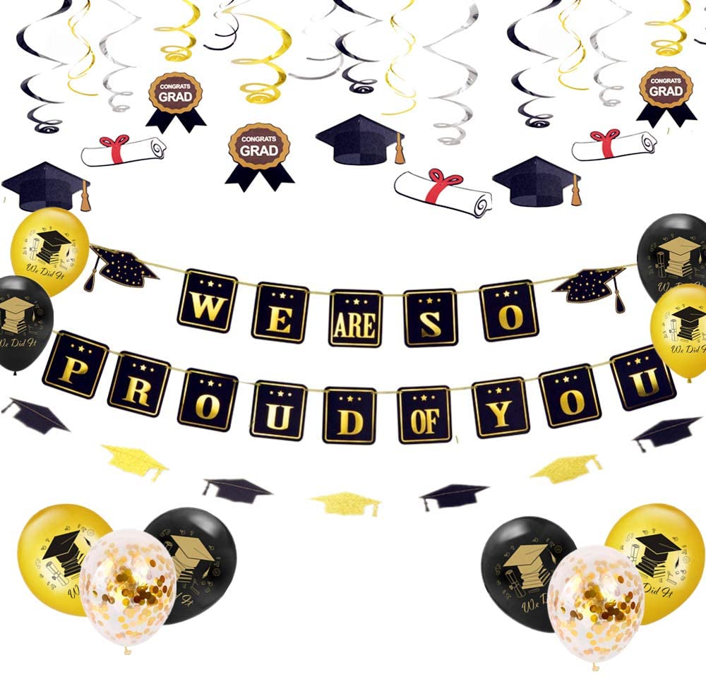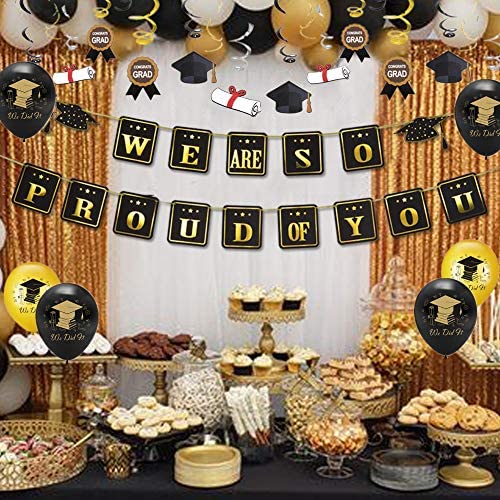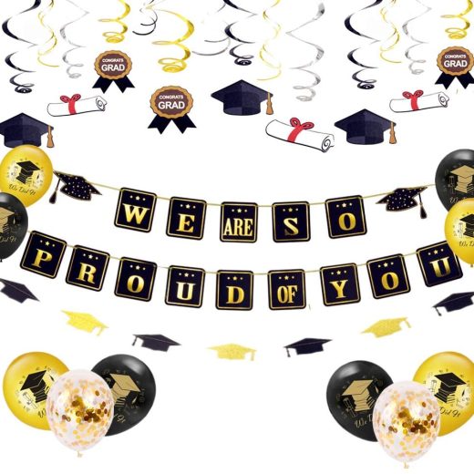Latex What you will get: 1 x We are So Proud of You banner, 15 x latex balloons. 6 x hang swirl. 1 x hat banner. Perfect for graduation party decoration supplies. Graduation Decoration: Perfect for graduation party, birthday, Congratulations, indoor or outdoor decor,or any theme parties. Perfect for hanging from branches and ceilings, or open against a wall, hanging up dessert tables, backdrops, and the overall party space. Perfect Graduation Party Decorations Graduation Commencement Decoration for College High School. Looking for more Party Supplies or Decoration Please check our store on !