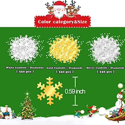 Super Shiny, Various ColorsPure white, bright silver and luxurious gold bring rich Christmas atmosphere to your family and friends, make your Christmas decoration more exquisite. Widely UsesSprinkle snowflake confetti on the table, throwing in the air, sprinkling on the floor, or use them for scrapbooking or crafts, filling gift boxes, bottles or invitation cards as decors. Great Confetti for Christmas Table DecorationsFeatured in romantic confetti and sparkly diamond, Confetti size: 0.59”, fake diamond size: 0.2”. Totally 1000pcs Christmas table decor on 3 packs (silver confetti, white confetti, gold confetti and fake diamonds). Variety OccasionsLeesgel Christmas confetti is good for Christmas party, winter wonderland decorations, baby showers, wedding, Valentine’s Day, etc. High QualityLeesgel Christmas table confetti made of durable plastic, double sided, it is sparkly no matter for which side.