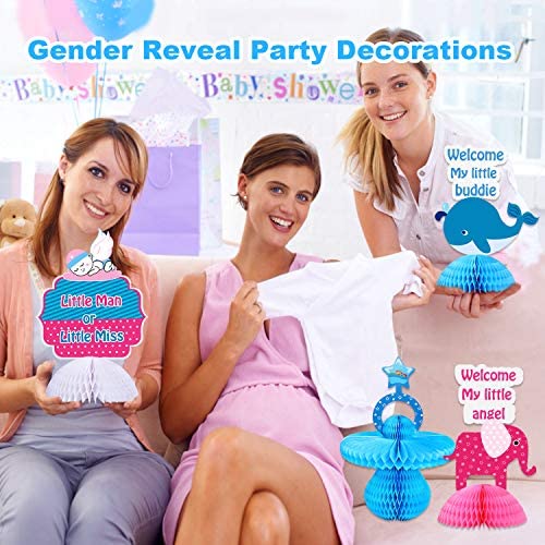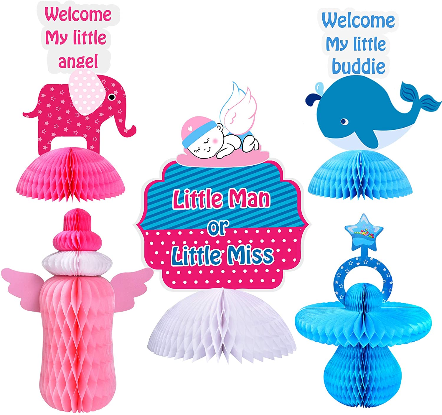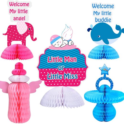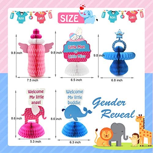 5pcs/SetThis set featured with Elephant, Dolphin, Pacifier, Baby Bottle, Angel, which are variety of classical gender reveal party elements.It is an Essential colorful eye catcher at your party ! Premium QualityOur product are made of papers ! 3D honeycomb paper + double sided cardstock . Easy to assebmly, jus open it and 1 step to stick together ! Multifunction OccasionsPerfect for gender reveal party supplies or decorations, baby shower party . Multifunction UseNot only for party supplies, but also for kids toys, games, or daily table decoarations in room ! 100% Money-Back Guarantee of SatisfactionIf you dont think the Our Gender Reveal Centerpieces is the BEST you could possibly buy, please return it and accept a FULL REFUND with our sincere apologies.