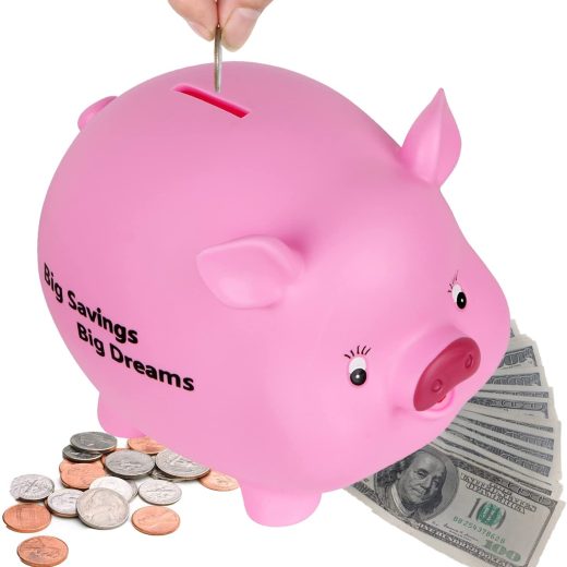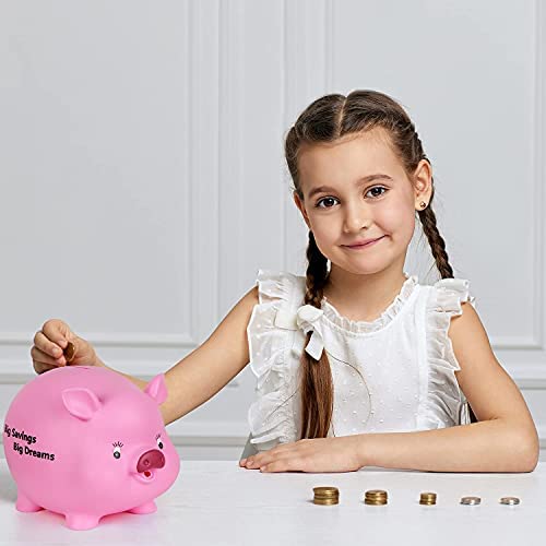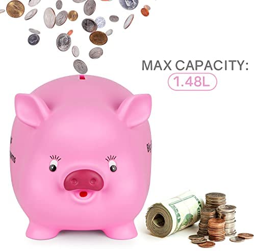 Unbreakable Piggy BankMade by non-toxic premium plastic material, lightweight, durable and strong, no worries about the damage of the coin bank when it drop down.In addition, on important holidays such as Christmas, Thanksgiving, birthday, Mothers Day, Fathers Day and school holidays, children can use their savings to buy gifts for themselves and friends. And parents. Cute Piggy BankThis piggy bank for kids outlooking is cute and attractive, boys and girls will love placing money in this adorable kids piggy banks and watching their big savings grow for next big dreaming purchase. Easy to OpenOur coin bank has a built-in plastic knob at the bottom, rotate the button to left place, easy for parents to help their kids to removing coins from the piggy bank.Removing the bottom cap was not so easy for kids,they couldnt get into endless cycle of removing coins from the bank and putting them back. Best Gift for Adults Boys and GirlsThe best gift for children, very suitable for adults boys girls and toddlers. It is a cute gift for children, including birthday gifts, holiday gifts and shower gifts. Sufficient CapacityThis money bank is about 6.89 x 5.04 x 5.31 inches and maximum capacity can reach 1.48L.Your child can take a long time to fill it up. The large capacity can bring your children a sense of satisfaction and accomplishment, thus fostering them to develop a good habit of saving money since childhood.