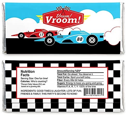 Our Let’s Go Racing – Racecar – Baby Shower or Race Car Birthday Party Candy Bar Wrapper Party Favors are an excellent choice for a great party favor – who doesn’t love chocolate! These wrappers are sold in sets of 24 and printed on premium-grade paper with a photo-like shine that’s made in the USA. Each one comes with a special message on the front and cute “nutrition facts” on the back. Your guest won’t be able to stop themselves from smiling! They are designed specifically for Hershey’s 1.55-ounce candy bars, and include the foil wrapper too. Our candy bar wrappers are easy to make, impressive to give and delicious to eat!