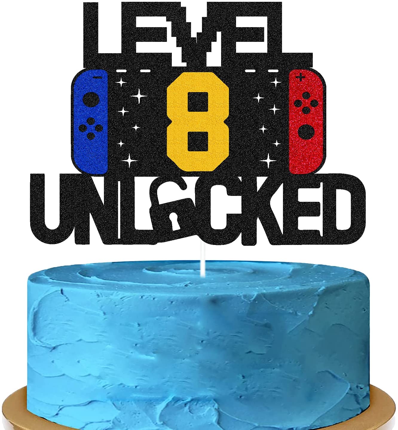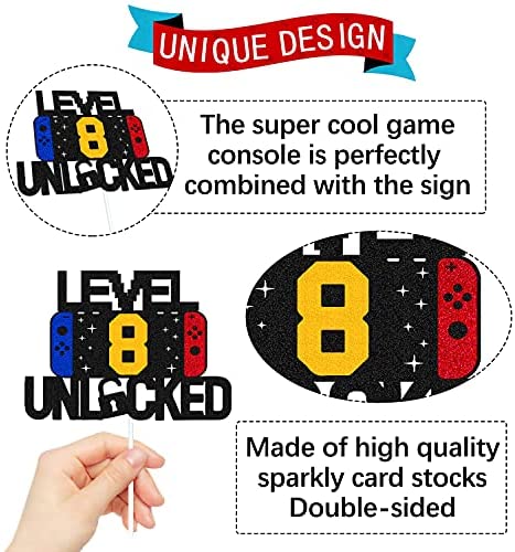 Level 8th Unlocked Sign Cake Topper Happy 8th Birthday Level Up Tenth Cake Decorations for Video Game Controller Themed Kids Boy Girl Bday Party Supplies Double Sided