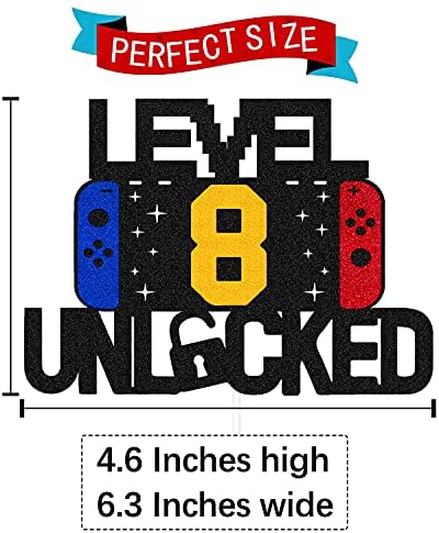 PACKAGE INCLUDES: You will receive 1 pack level 8th unlocked cake decorations. Perfect cake decoration for many scenes: level 8th up game video theme birthday party, 8s years old birthday party, or other etc. HIGH QUALITY MATERIAL: Level 8th Unlocked birthday cake decorations is made of high quality black glitter cardstock, the glitter won’t fall off. There is also glitter on the back side with food grade paper sticks. Level 8s up birthday cake topper is ready to decorate the top of cake for that special game video theme irthday! PRODUCT SIZE: 8th level unlocked happy birthday cake topper size approx. 4.6 x 6.3 inches. The food grade paper sticks size is approx. 7 inches. It is suitable for a full size smash cake or a fondant cake. PRE-ASSEMBLED: level 8th unlocked Cake Topper is carefully glued by handmade in advance. You don’t need to spend time to assemble it. All you need to do is to open the package and decorate your lovely cake directly. Do not put these cake toppers in oven or microwave, they are intended for decoration only. Product was carefully checked before going up to sell, If they do not meet your need, our customer service are hassle free for you to resolve your issue. If you are not satisfied with our level 8th unlocked cake topper received, pls contact with us!