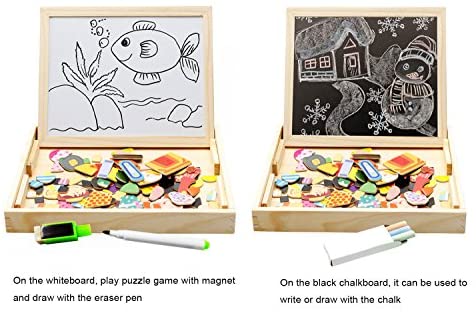 ATTENTION!!! There is a protective film on this whiteboard that needs to be taken off prior to using Including A Dry Erase marker with an eraser on the end cap, a Three piece Chalk set , an eraser for the chalk and an idea booklet for arranging the shapes Double sided art board, both white dry erase and black chalk board. Over 100 colorful different animals themed wooden pieces with full magnetic backing The wooden box is designed with a removable board lid which can stand up in the box Approved ASTM and CE test .Ideal for travel, it is better to lock the board in to place through rubber band . Box size 11.8*9.4*1.5 inches. Containing many small parts, recommended 3 years up