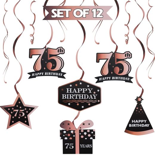 LINGTEER Happy 75th Birthday Rose Gold Swirls Streamers – Cheers to 75th Birthday 75 Years Old Bday Party Hanging Decorations.