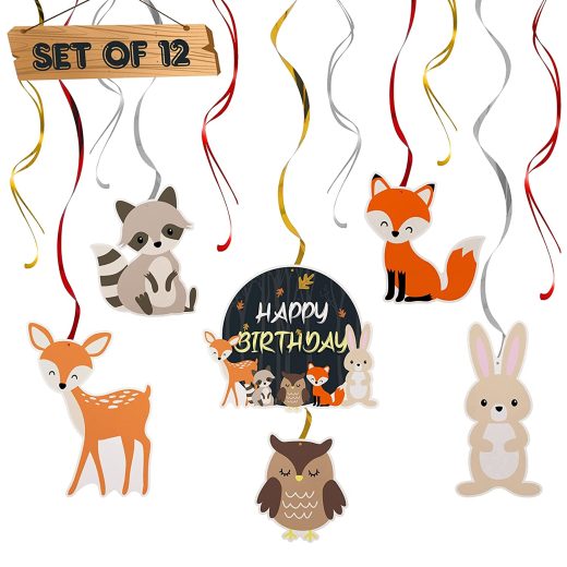 LINGTEER Woodland Creatures Birthday Swirls Streamers – 12 Pcs Forest Jungle Animals Birthday Hanging Backdrop Party Decorations.