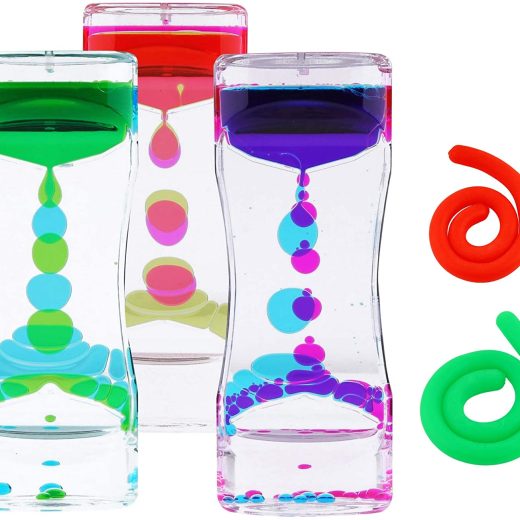 OUR BUNDLE INCLUDES 3 LIQUID MOTION BUBBLERS AND 3 STRETCHY TOYS – Lolo Toys 6-piece Fidget Set includes 3 liquid timers in Fuchsia, Blue and Green as well as 3 matching strechy string toys in Fuchsia, Blue and Green; Each water bubbler measures 5.7 inches long and 2.2 inches wide while each stretchy toy measures 11.2 inches long; Our figit toys for school, office or home are manufactured with high quality, safe and durable materials STRESS AND ANXIETY RELIEF FOCUS TOOL – Our sensory fidgets for kids and adults serves as the perfect anxiety toy or stress relief toys by having a calming effect as it stimulates the visual sense; Our water bubblers and tangles fidget toy pack can provide hours of soothing entertainment and will never run out of energy as it does not require any mechanical parts; The rubber string will keep your fingers active to keep your mind completely focused VISUAL AND TACTILE SENSORY TOOLS FOR ADHD, AUTISM AND MUCH MORE – Lolo Toys unique sensory toy set helps all children and especially those with autism, ADHD, ADD and hyperactivity as it promotes relaxation, stress relief and anxiety relief; These kids timers will help improve visual tracking and visual focusing skills while the stretchy toy will provide tactile stimulation; Our autism toys for boys, girls and adults have the perfect balance of sensory activities to either play or relax IDEAL FOR OFFICE DESK TOYS, SCHOOL, HOME OR GIFTS – Our office toys serves as the ideal desk toy decoration as well as a sensory timer; Watch the power of gravity take place as the colored bubbles travel down in slow motion; Once the color drops serenely reach the bottom just turn it over and continue enjoying these sensory bottles experience; Our fidget pack also works great as stress relief gifts or relaxing gifts; Our oil timer is also often called mini lava lamp or water hourglass timers WARRANTY INFORMATION – We ensure that our cool fidget toys for adults and kids will meet your expectations; If for any reason, it doesn’t, we offer returns without questions asked; If you have any issues with our sensory bubble tube and pulling string figets toys, do not hesitate to contact us and we will be happy to ensure you have a positive experience while using our fun liquid timers; These hypnotizing fidgeting tools serve as the ultimate distraction and satisfying toys or desktop décor