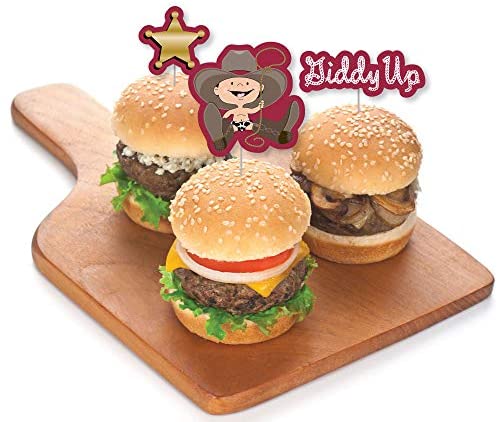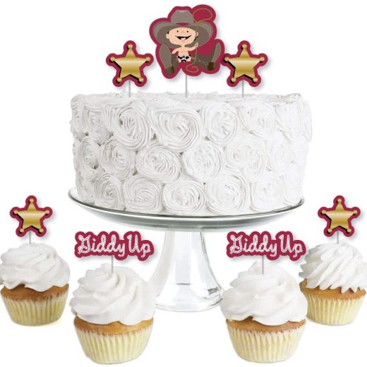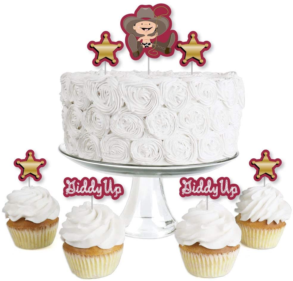 Little Cowboy Dessert Cupcake Toppers INCLUDES 24 clear treat picks, 24 shaped paper cut outs and stickers for easy assembly. DIY Little Cowboy cupcake supplies are perfect for a baby shower or birthday party. Plastic clear treat pick SIZE 3.5 inches tall with the completed height of the Little Cowboy Dessert Cupcake Topper depending on where the plastic pick is attached to the shaped paper cut out. Cupcake toppers are perfect for standard cupcakes and can also be added to appetizers and individual servings of other sweet treats such as brownies or donuts, and even used to create small fruit kabobs. EASY PARTY DECORATIONS: Little Cowboy Baby Shower or Birthday party picks make it easy to style western theme party. Create impressive cupcake towers with decorated treats placed on a tiered stand at the candy buffet table, style adorable tables with individual cupcakes at each place setting, or make creative centerpieces using decorated treats and a coordinating treat stand. PREMIUM PARTY SUPPLIES: Clear treat picks are made of food-grade plastic and packaged in a food-safe environment. The Little Cowboy paper cut out toppers are professionally printed on heavy-duty cardstock paper with themed art on one side and a coordinating pattern on the back. Cut outs will quickly attach to the clear dessert pick and then easily insert into your party appetizers or desserts. EASY ASSEMBLY INSTRUCTIONS INCLUDED: Clear treat picks and Little Cowboy shaped cutouts will ship with easy assembly instructions to create unique dessert cupcake toppers.