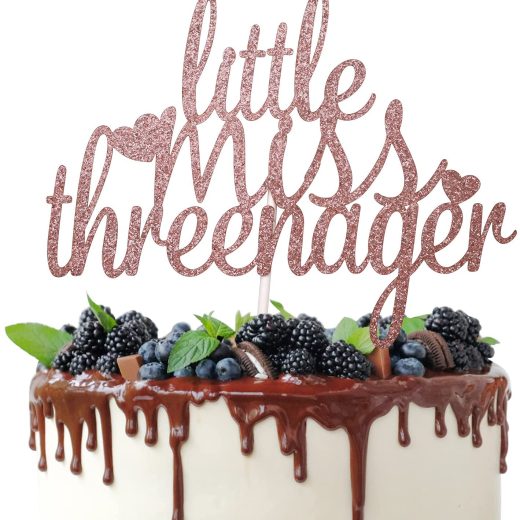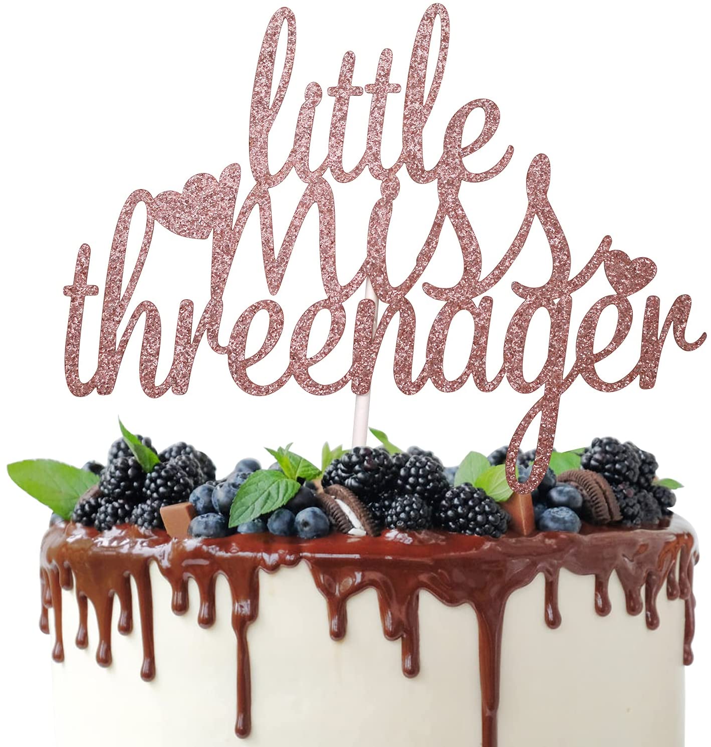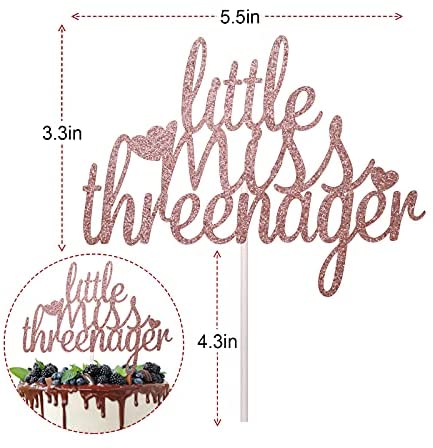 Special design: Nice font design with the rose gold heart and Little Miss Threenager words to highlight 3 years old theme birthday party. Exquisite cake decor, full of adorable element, makes you stand out in party Premium material: We use no-shedding rose gold cardstock and food-safe paper sticks. So adorable and shiny, the glitter doesnt fall off. Delicious desserts necessary decorations supplies Nice size: The height is about 3.3 inches, width is about 5.5 inches. It comes on 5.9 inch sturdy paper sticks, so it can stand firmly on top of the cake. Its an ideal size for birthday cake if your cake size is 6 to 8 inches Double-sided: Designed by upgraded version double-sided material, the other side is also glittering. Our cake topper is pre-assembled. Its a simple and interesting way to decorate your birthday theme cake Birthday Party Decor: Brighten your loved ones event with this adorable third birthday cake topper. We place our cake toppers on durable cardboard for protection, dont worry about damage