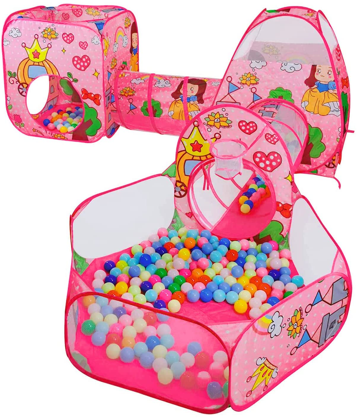 LOJETON 5 Piece Kids Ball Pit Tents, Princess Theme Pop up Tents for Babies, 2 Tents + 2 Crawl Tunnels + 1 Ball Pit with Basketball Hoop, Indoor Outdoor Playhouse Toys for Girls (Pink