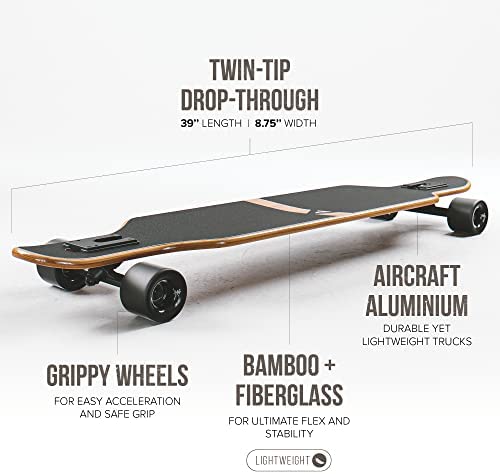 39” BAMBOO & FIBERGLAS: The WEIRD is equipped with a solid, medium-sized 39 inch deck for high flexibility when cruising while forgiving mistakes when riding fast. Built with a three-layered bamboo core for flex. The top and bottom fiberglass layer provide stability and strength. Especially appreciated at higher speeds. The WEIRD is your strong, durable yet flexible companion catering to all levels and riding styles. Own the streets with this one!: WEIRD – PICK THE RIGHT BOARD: This symmetrical Twin Tip Drop Through is perfect for beginners just joining the exciting world of longboarding and for experienced riders leveling up their freeride and downhill game! The low center of gravity makes this cruiser board your ideal companion for longer distances, freestyle and cruising.