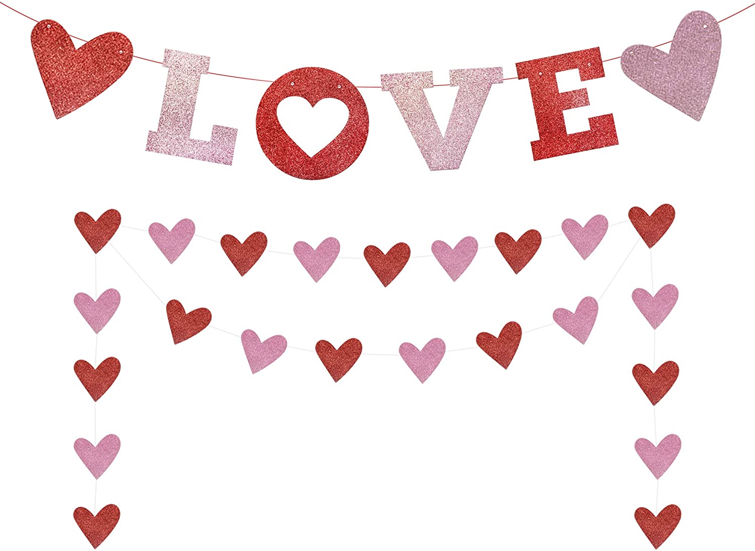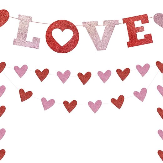 Happy Valentine’s Day!PRE-STRUNG: Our Love Banner comes pre-strung. Save your time for preparing the home decorations. Valentine’s decorations and supplies should be easy to use, so we took care of this for you. Love Banner Decorations: Best choice for you! Our heart garland banner is perfect for your Valentine’s Day Decorations, Bachelorette, Engagement, Anniversary Wedding Party Decorations. UNIQUE DESIGN: We specially design every letter with a glittery card stock. The special color also matches most party supplies perfectly. Start your decorations now!