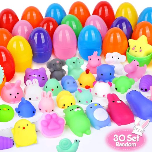 LUDILO 30Pcs Easter Eggs + 30Pcs Mochi Squishy Toys Easter Basket Stuffers Easter Egg Fillers Easter Toys Mini Squishies Party Favors for Kids Animal Squishys Surprise Egg Hunt Gifts, Random