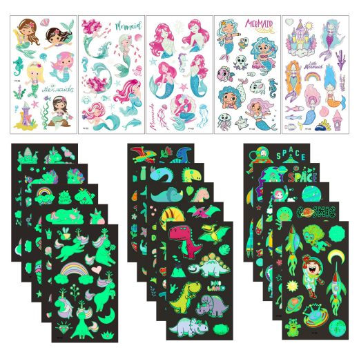 Luminous Temporary Tattoos for Kids, 20 Sheets 200pcs Patterns Fake Funny Cute Waterproof Mixed Style Cartoon Fake Tattoo, Glow in The Dark Unicorn Dinosaur Mermaid Outspace Tattoos, Boys Girls Party Supplies Favor Decorations