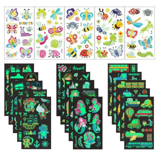 Luminous Temporary Tattoos for Kids, 20 Sheets 224pcs Patterns Fake Funny Cute Waterproof Mixed Style Cartoon Fake Tattoo, Glow in The Dark Mermaid Pirate Insect Traffic Car Tattoos, Boys Girls Party Supplies Favor Decorations