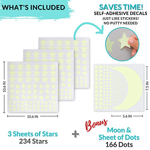 [ Package Includes: ] 400 glow stars of three different sizes w/BONUS crescent moon (7.4”) and dots to create the perfect galaxy room decor. You can create constellations and transform any kids room decor to feel as if you are floating through the galaxy. This makes the perfect galaxy space decoration for any room, including a media room! [ Kids Will Love Bedtime ] The illuminating moon and stars will act as a ceiling light, wall light or night light that will vanquish nighttime fears. Your kids will rush to go to bed just to count the stars! Your child will no longer be afraid of the dark and drift into a sweet dream with the star ceiling above them. [ Save Money on Electricity ] Stop wasting money on a night light! These illuminating stars will act as a ceiling light, wall light or night light that glows for HOURS. They only require 10 minutes of exposure to light to charge them before they glow for HOURS. To recharge them, expose them to light at least 5 minutes daily. [ Wont Damage Walls ] They look just like glow in the dark star stickers. These self-adhesive decals are so easy to apply! Save lots of time as no putty or tape is needed. Just peel them off the sheet and stick it firmly on a flat ceiling or wall. You can remove them without any damage to the walls and/or ceilings. [ Giving Back ] A portion of every purchase will be donated to organizations that rescues children from human trafficking, care for them and prosecute the perpetrators. Makes the best Christmas gift and stocking stuffer.