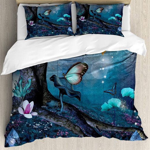 Size Queen Included Components Pillow Sham, Duvet Cover Material Fabric Color Dark Blue Theme Forest,Fantasy