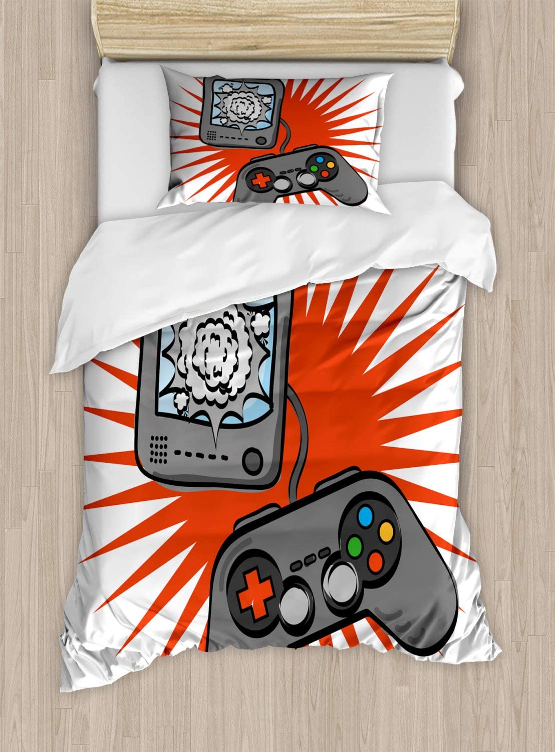 Lunarable Games Duvet Cover Set, Video Games Themed Design in Retro Style Gamepad Console Entertainment, Decorative 2 Piece Bedding Set with 1 Pillow Sham, Twin Size, Orange White