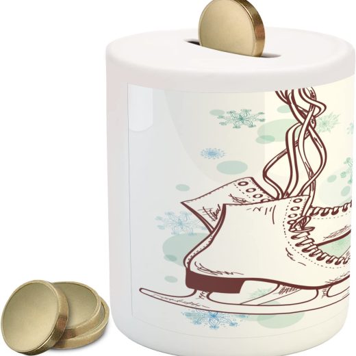 Lunarable Winter Piggy Bank, Retro Skates with Snowflakes Background Ice Skating Christmas Digital Print, Ceramic Coin Bank Money Box for Cash Saving, 3.6